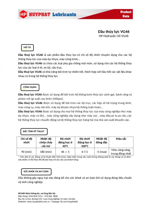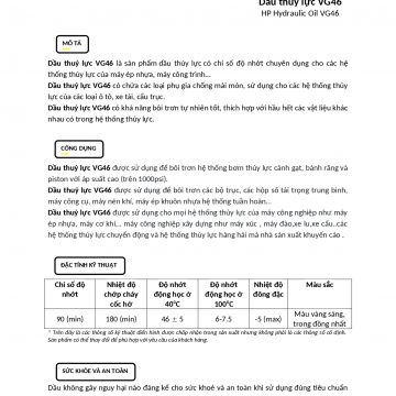 Các loại dầu thuỷ lực được sản xuất từ dầu khoáng có chất lượng cao, có tính kháng oxi hoá cao. Chống ăn mòn và mài mòn rất tốt.